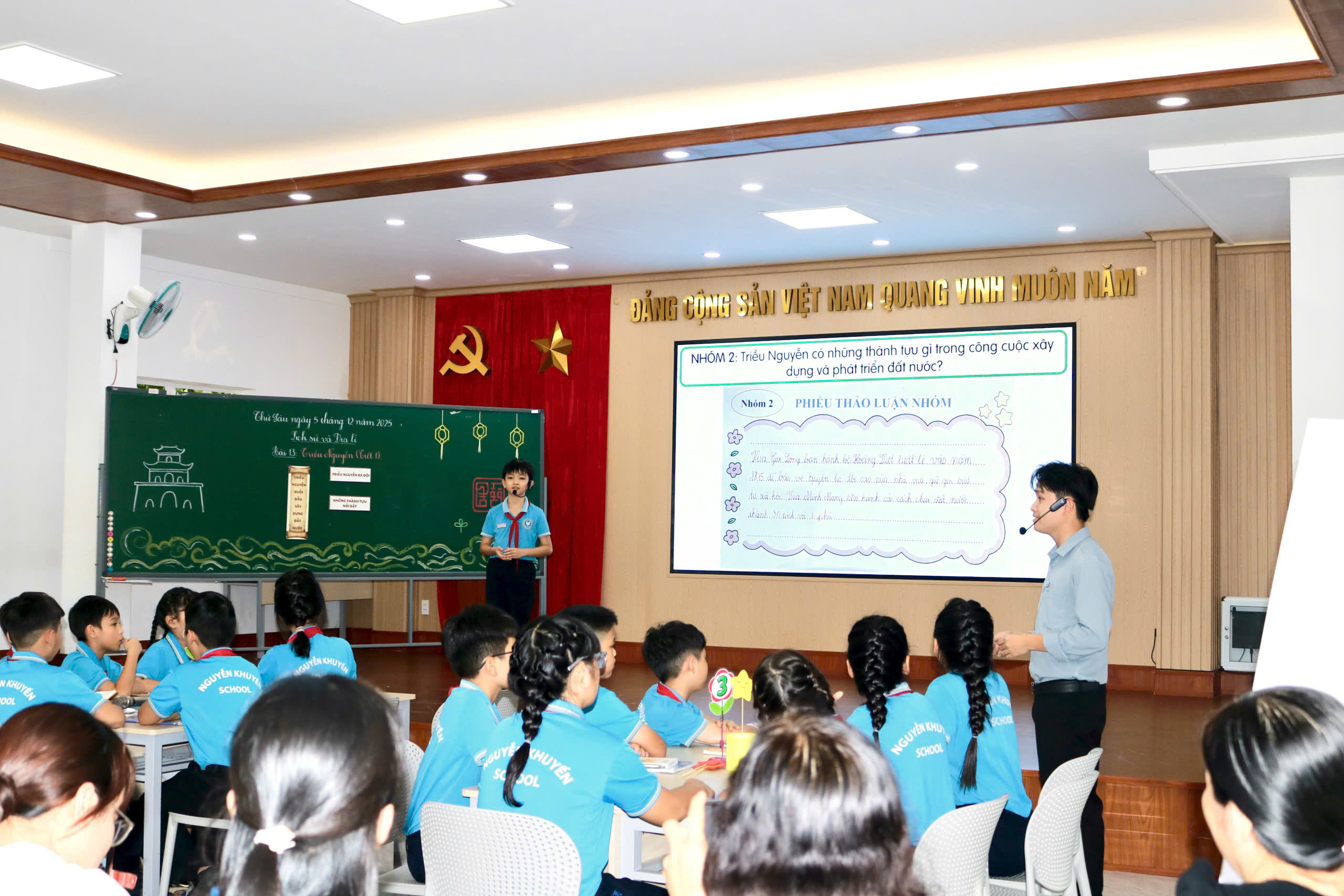 Thực hiện nhiệm vụ năm học 2025 – 2026 của Sở Giáo dục và Đào tạo tỉnh Đắk Lắk và kế hoạch sinh hoạt cụm chuyên môn số 2, chiều ngày 5/12/2025, Trường Tiểu học và THCS Nguyễn Khuyến đã tổ chức thành công sinh hoạt chuyên môn theo hướng nghiên cứu bài học môn Lịch sử và Địa lí lớp 5, bài 13: Triều Nguyễn (Tiết 1) với sự tham dự của 33 CBQL và 49 giáo viên các trường trong cụm.