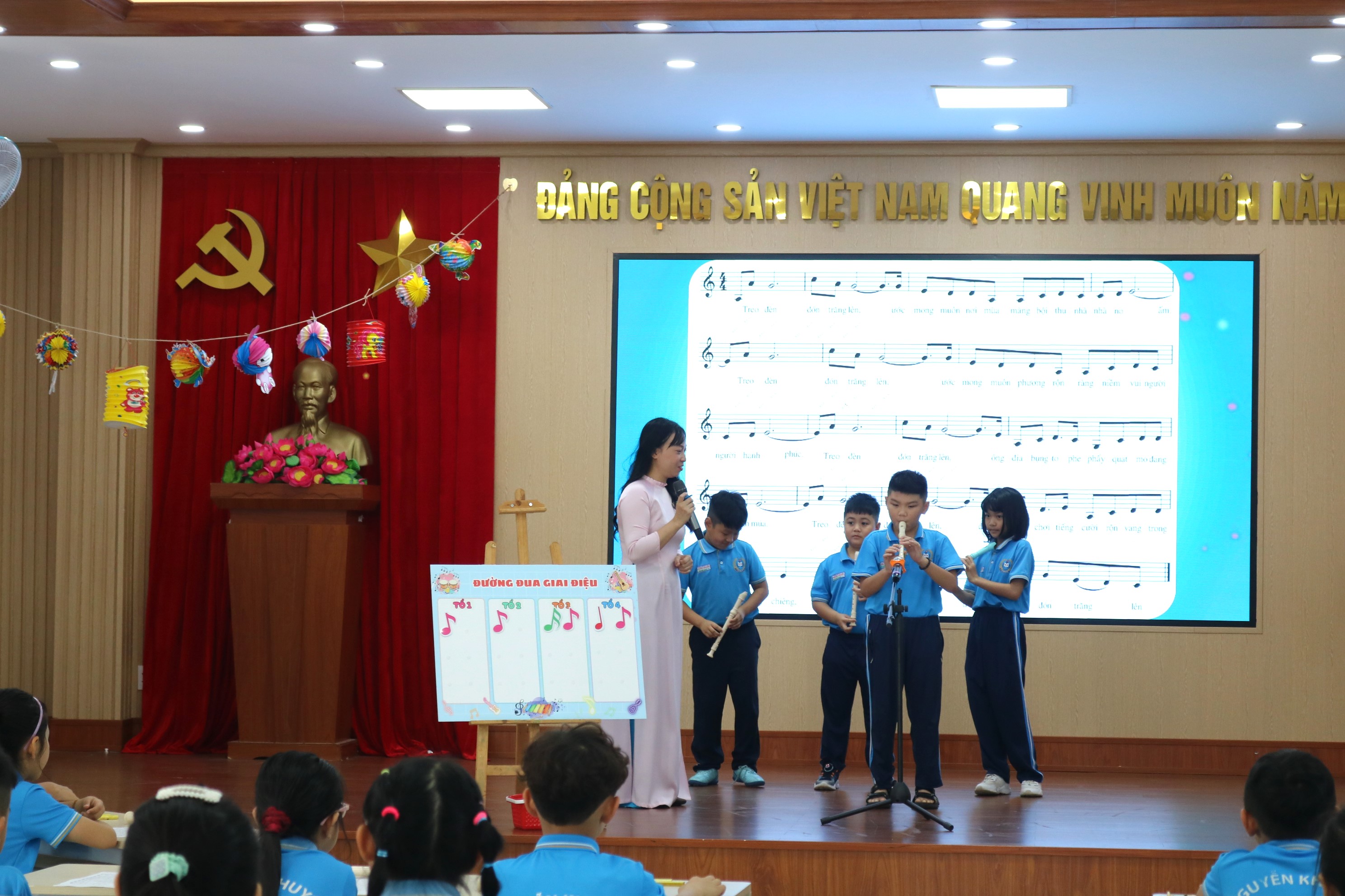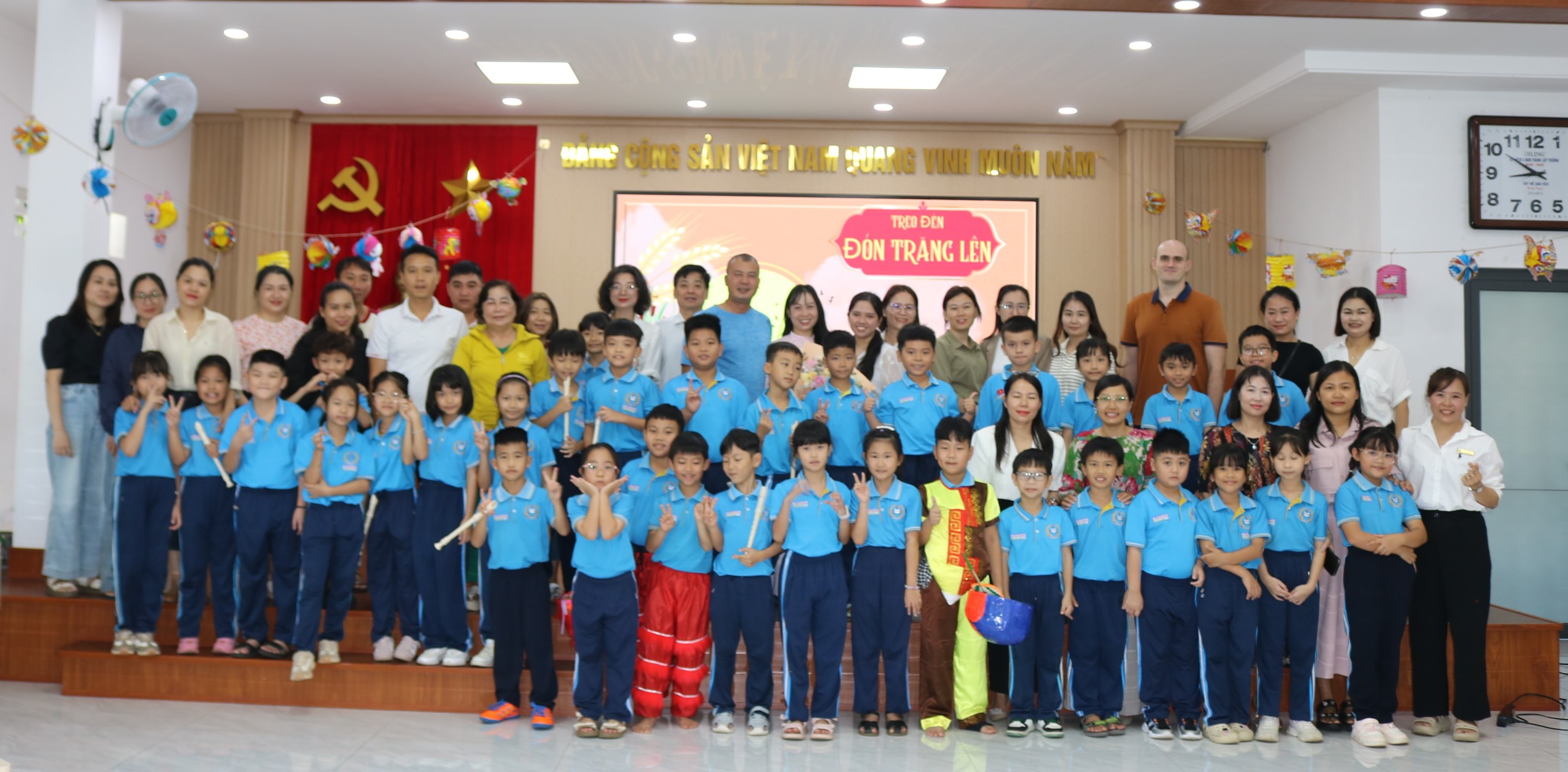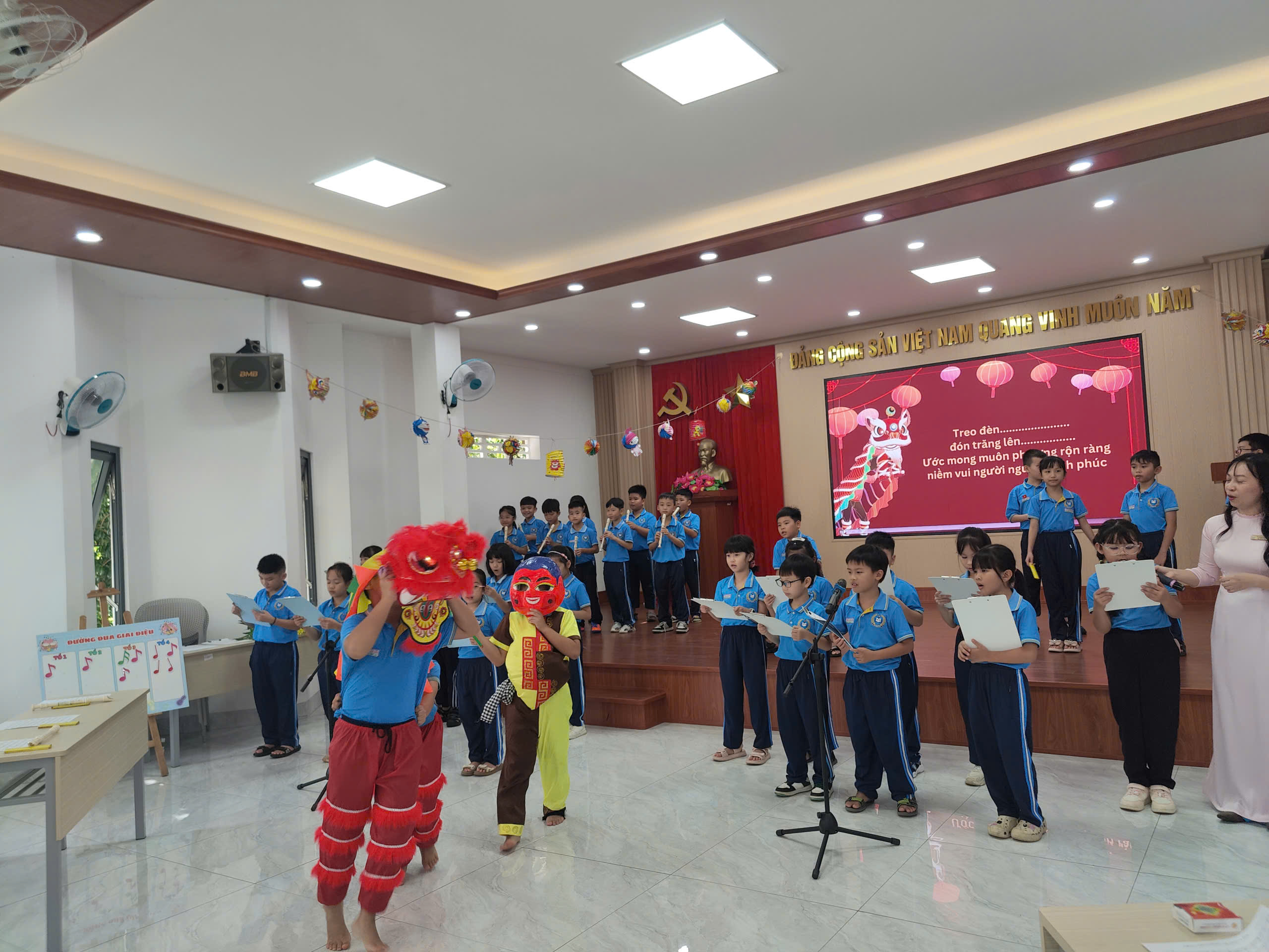 Với chủ đề Trung thu, các em học sinh lớp 3A2 đã hóa thân thành những “nghệ sĩ nhí” đầy đáng yêu, say sưa với những nhạc cụ: sáo, phách, trống, đàn và hoà mình cùng giai điệu trong ca khúc "Treo đèn đón trăng lên" của tác giả Kat Ha. Nhịp thanh phách rộn ràng quyện cùng tiếng đàn mang đến một sắc màu âm nhạc vui tươi và đáng yêu. Đặc biệt, sự xuất hiện bất ngờ của lân và ông Địa đã làm không khí Trung thu trong lớp học thêm náo nhiệt, để lại nhiều tiếng cười và kỷ niệm đẹp cho thầy trò cũng như phụ huynh tham dự.