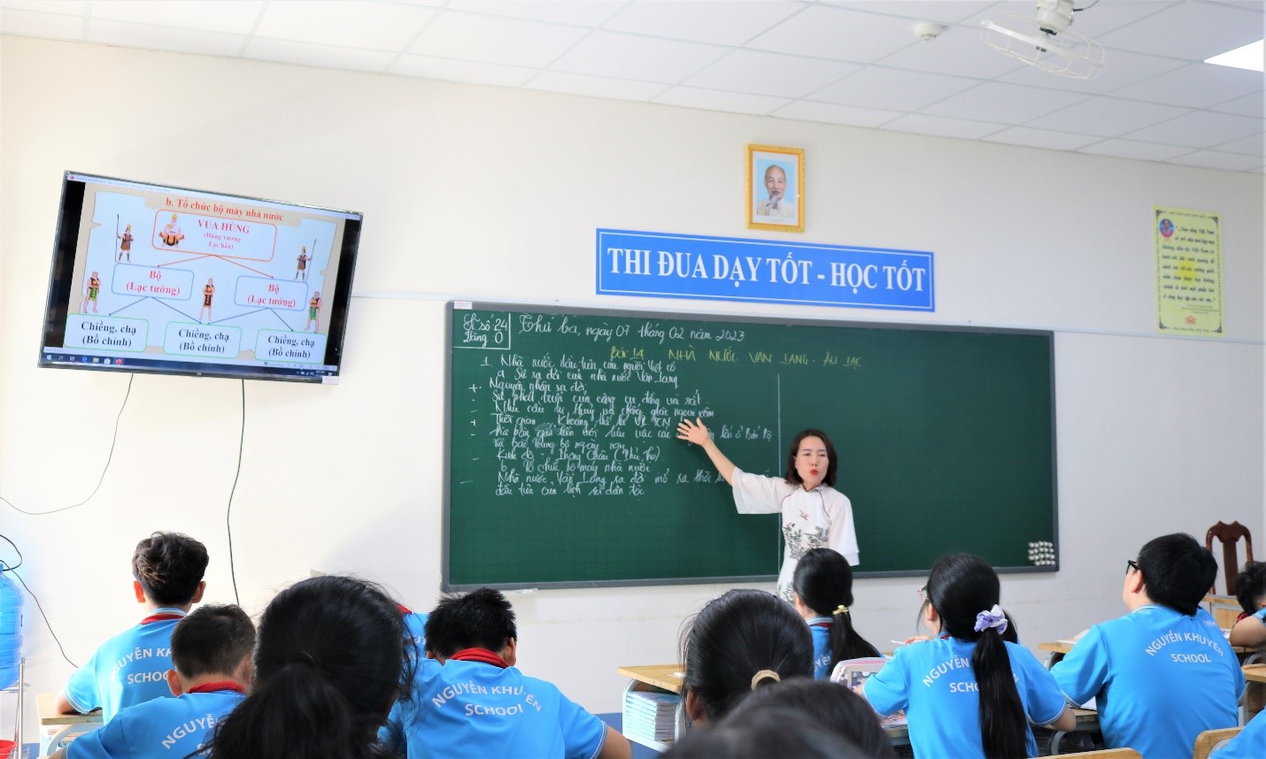 Thực hiện nhiệm vụ năm học 2025 – 2026 của Sở Giáo dục và Đào tạo tỉnh Đắk Lắk và kế hoạch sinh hoạt cụm chuyên môn số 2, chiều ngày 5/12/2025, Trường Tiểu học và THCS Nguyễn Khuyến đã tổ chức thành công sinh hoạt chuyên môn theo hướng nghiên cứu bài học môn Lịch sử và Địa lí lớp 5, bài 13: Triều Nguyễn (Tiết 1) với sự tham dự của 33 CBQL và 49 giáo viên các trường trong cụm.