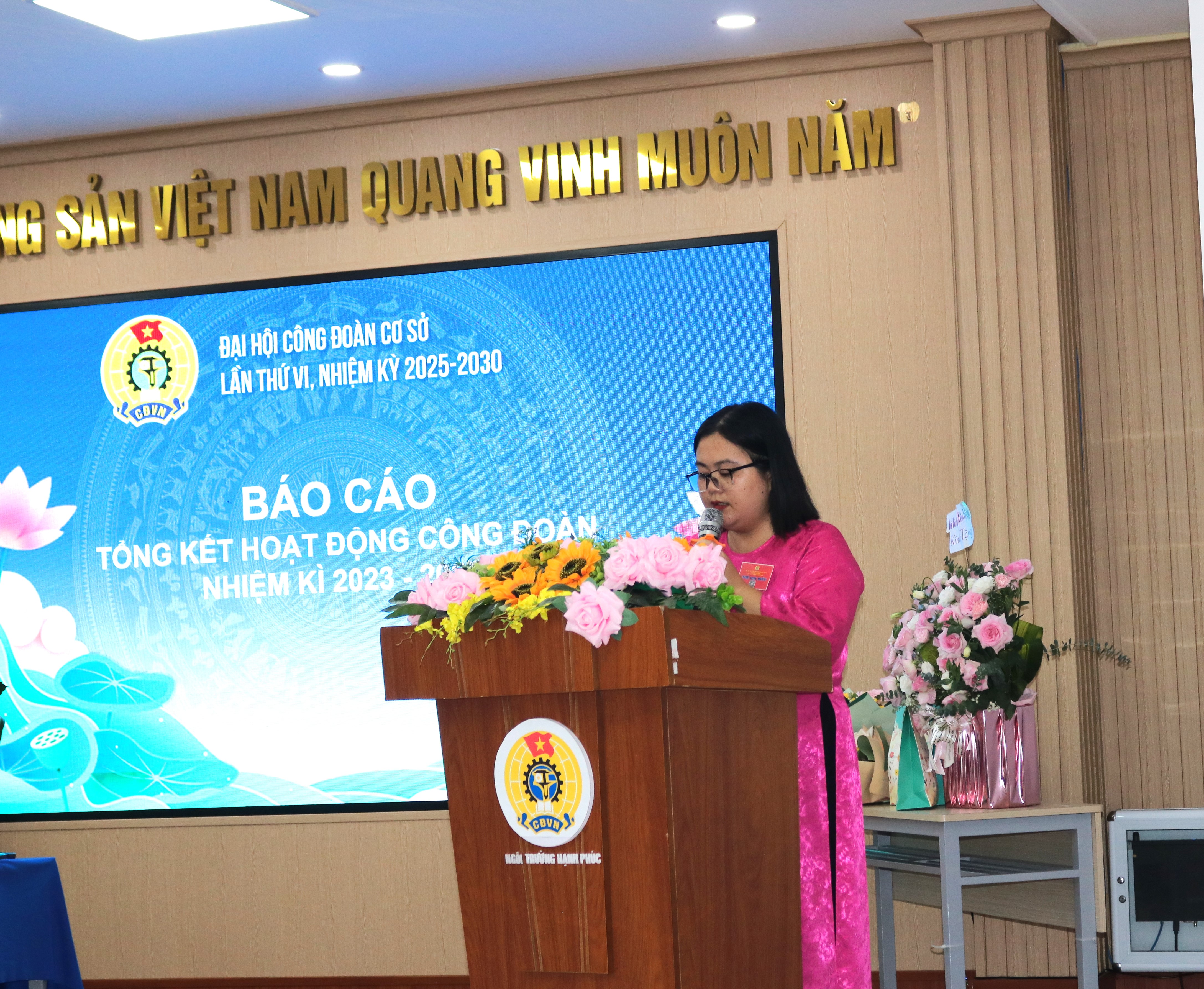 Tại Đại hội, các đại biểu đã nghe và thảo luận Báo cáo tổng kết hoạt động công đoàn nhiệm kỳ 2020–2025, đánh giá những kết quả nổi bật, rút ra bài học kinh nghiệm và chỉ ra những hạn chế cần khắc phục; đồng thời đề ra phương hướng, nhiệm vụ trọng tâm cho nhiệm kỳ 2025–2030, trong đó chú trọng nâng cao hiệu quả phong trào thi đua, chăm lo quyền lợi chính đáng của đoàn viên, đẩy mạnh các hoạt động văn hóa, thể thao và chuyên môn. Đại hội cũng đã tiến hành bầu Ban Chấp hành Công đoàn cơ sở khóa VI, gồm những đồng chí tiêu biểu về phẩm chất, năng lực, tinh thần trách nhiệm và lòng nhiệt huyết cống hiến cho tập thể.