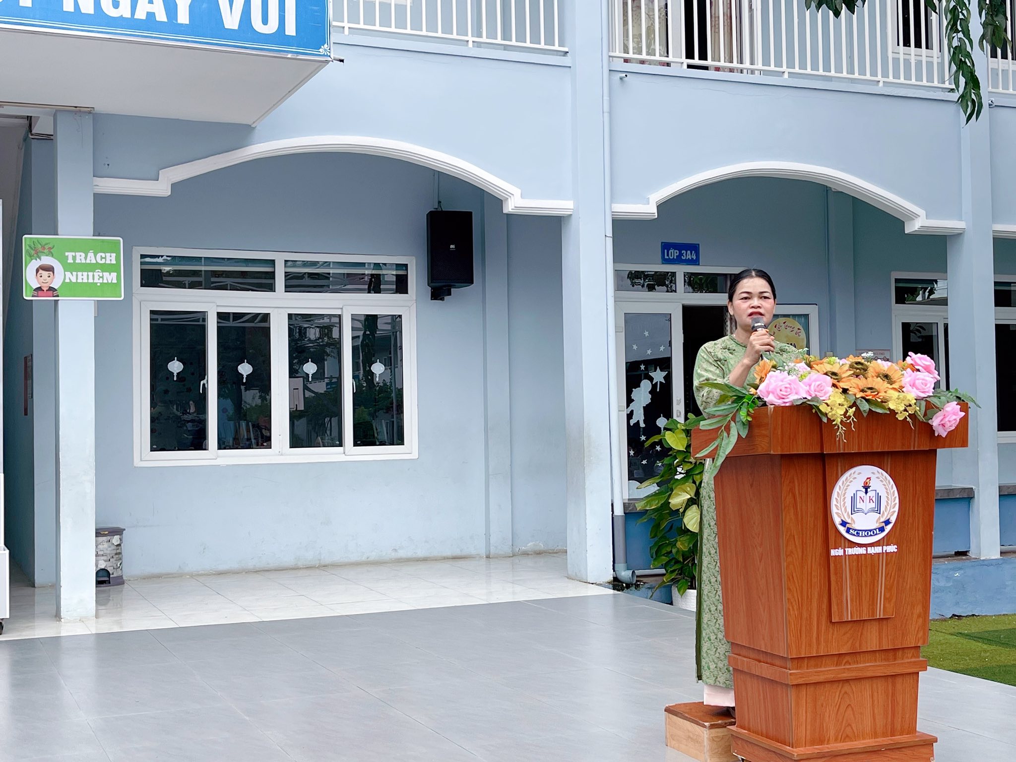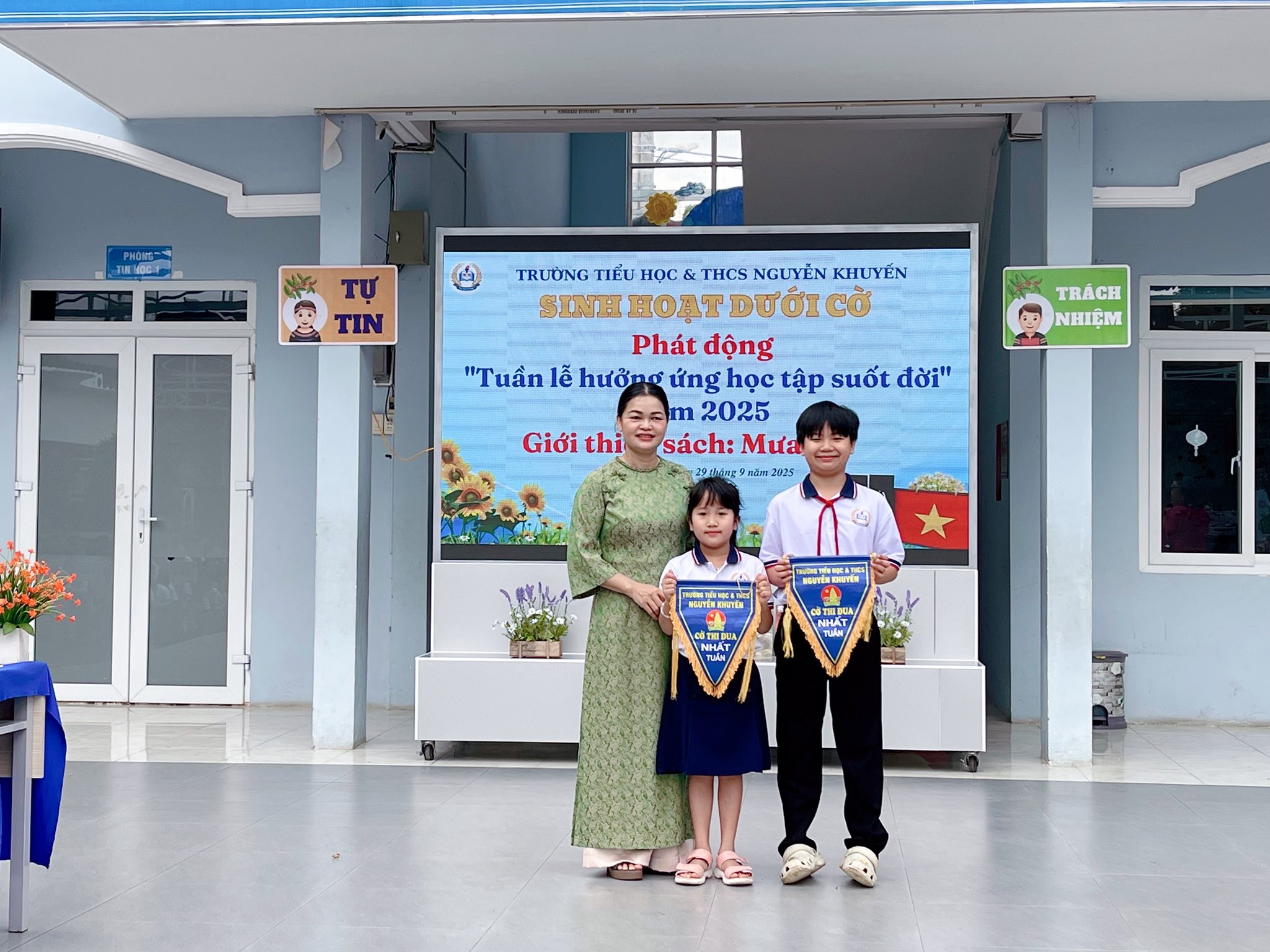 Cô hiệu trưởng trao cờ thi đua nhất tuần cho lớp 2A1 và lớp 8A2