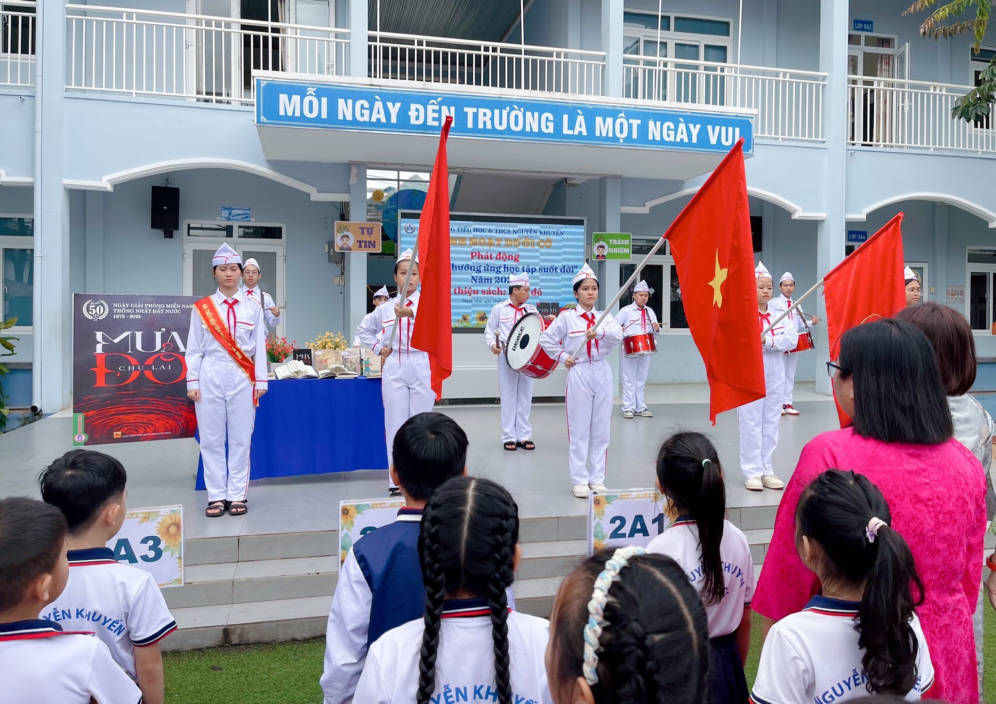 Phối hợp phát động Tuần lễ học tập suốt đời năm 2025: Thư viện nhà trường đã giới thiệu đến các em học sinh cuốn tiểu thuyết “Mưa đỏ” của nhà văn Chu Lai. Đây chính là hoạt động mở đầu cho phong trào “Mỗi tuần một câu chuyện đẹp, một cuốn sách hay, một tấm gương sáng” - Một trong những nhiệm vụ trọng tâm, xuyên suốt của Liên đội nhà trường trong năm học 2025 – 2026.
