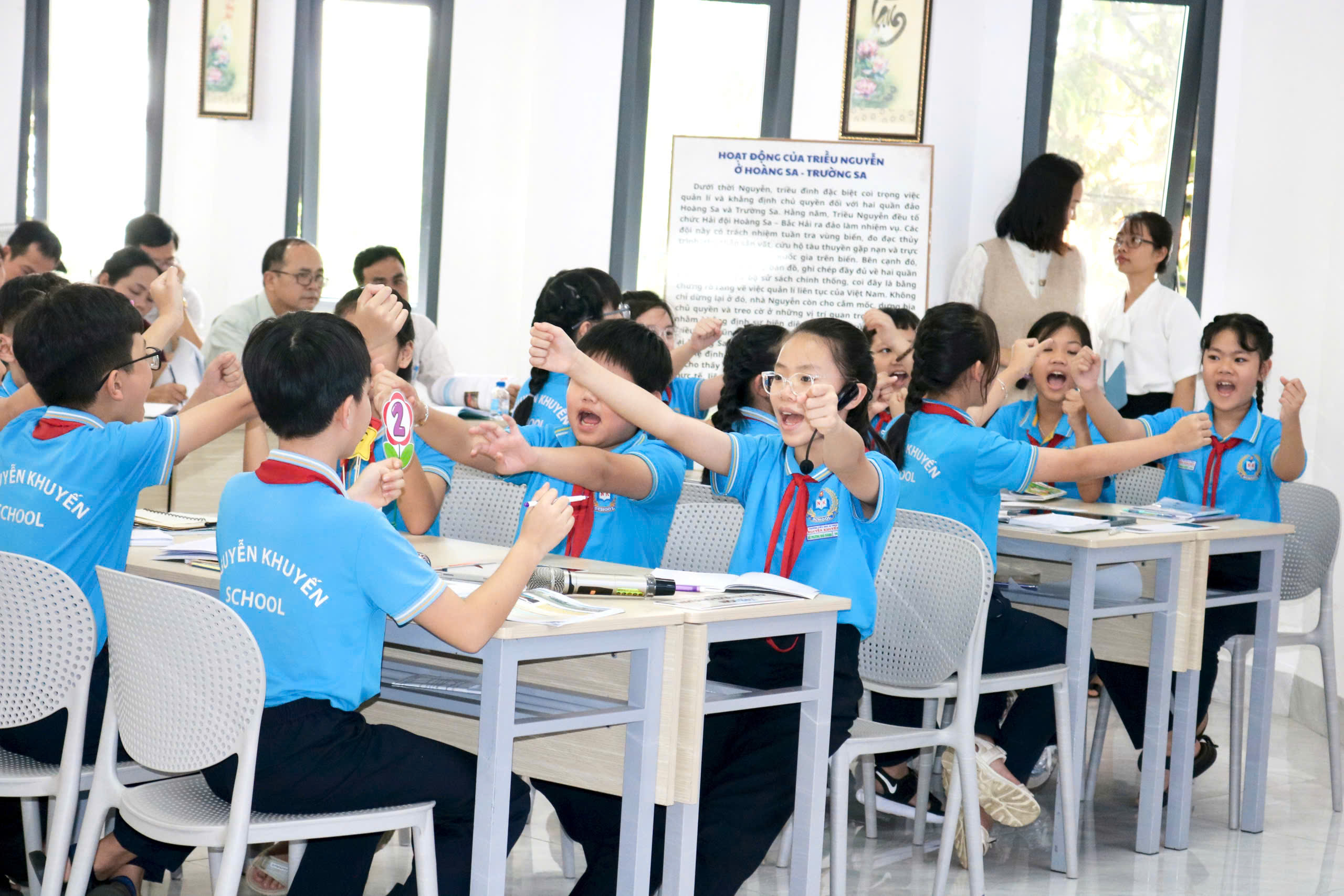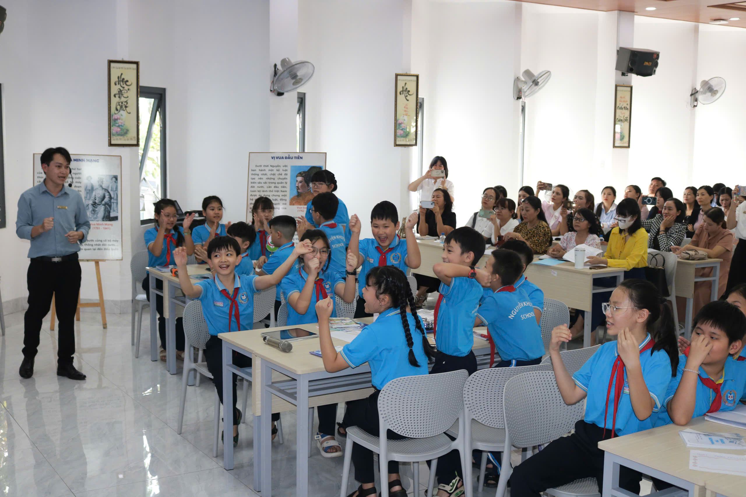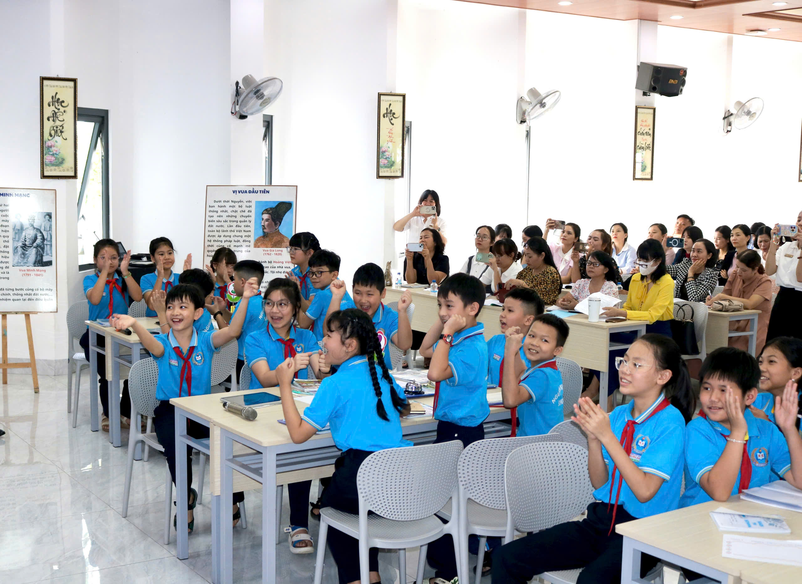 Trong tiết dạy, thầy Hoàng Văn Đạo (giáo viên trực tiếp giảng dạy), cô Lê Thị Thi (TTCM khối 4) cùng đội ngũ giáo viên khối 5 đã ứng dụng hiệu quả các công cụ AI như Canva, Gemini, Kahoot… vào từng hoạt động học tập của học sinh. Giáo viên đồng thời kết hợp linh hoạt các phương pháp trực quan, hoạt động nhóm và hệ thống câu hỏi gợi mở, giúp học sinh chủ động tiếp cận kiến thức, hiểu sâu hơn về bối cảnh hình thành, công cuộc xây dựng đất nước và những dấu ấn nổi bật của triều Nguyễn – triều đại phong kiến cuối cùng trong lịch sử Việt Nam.