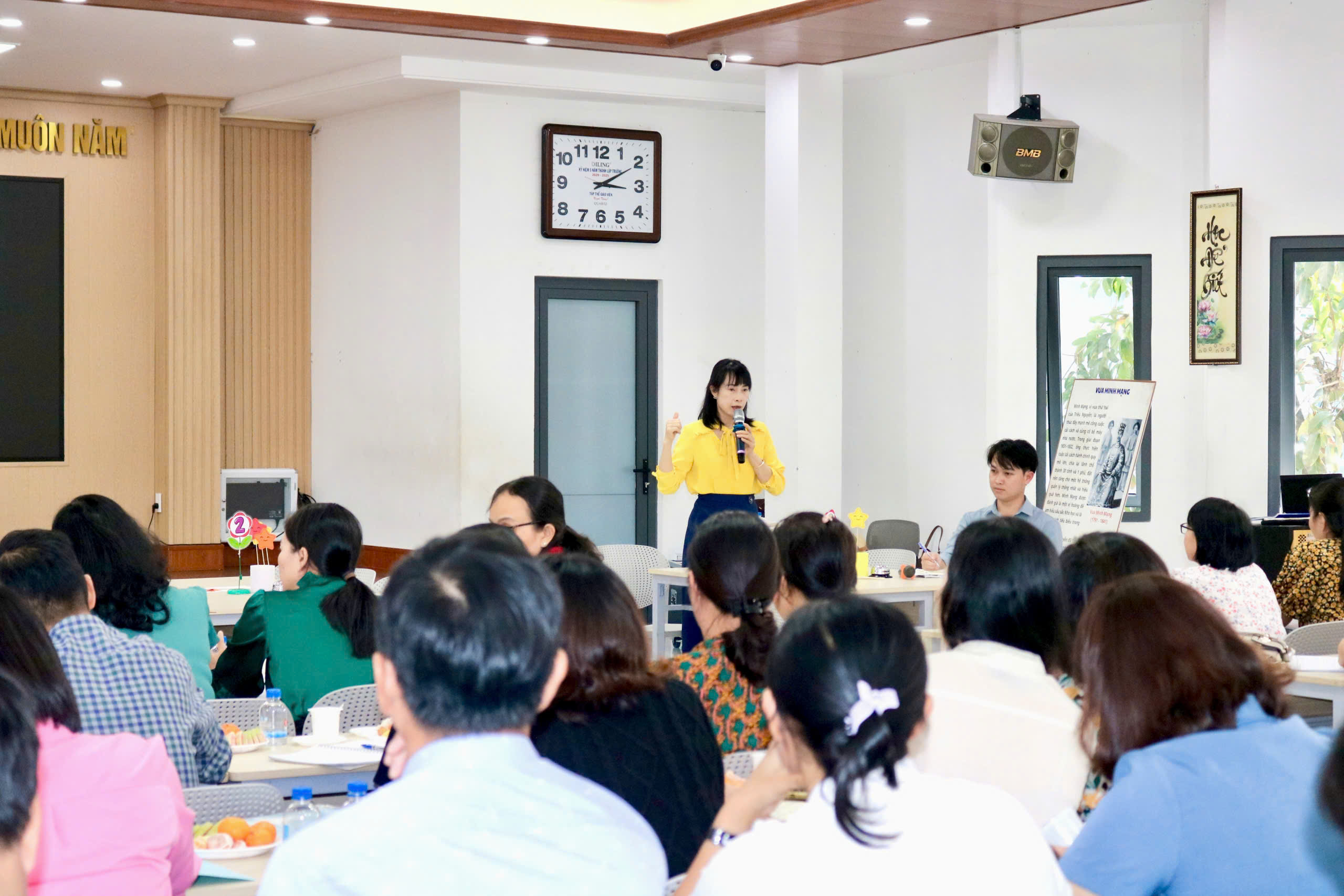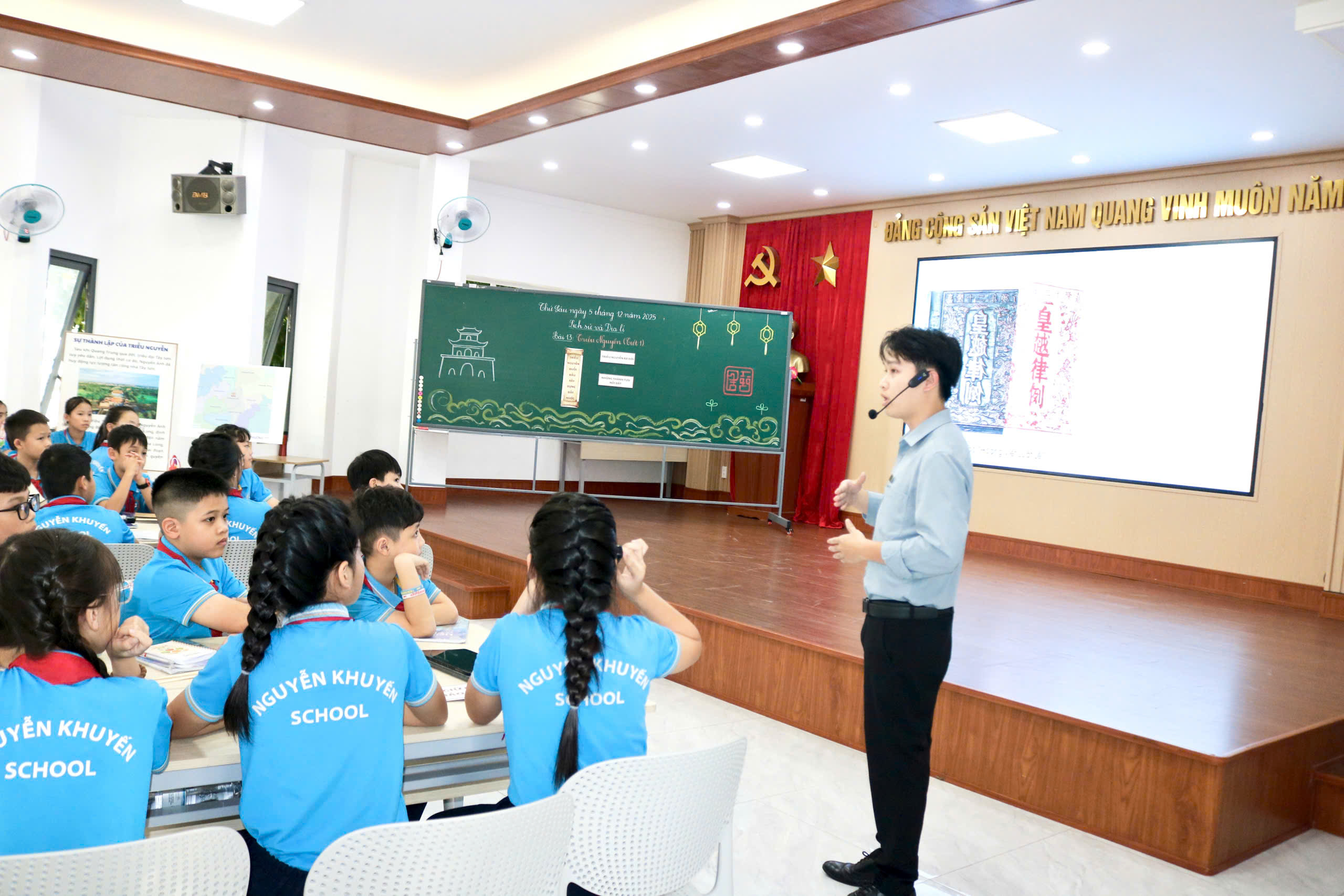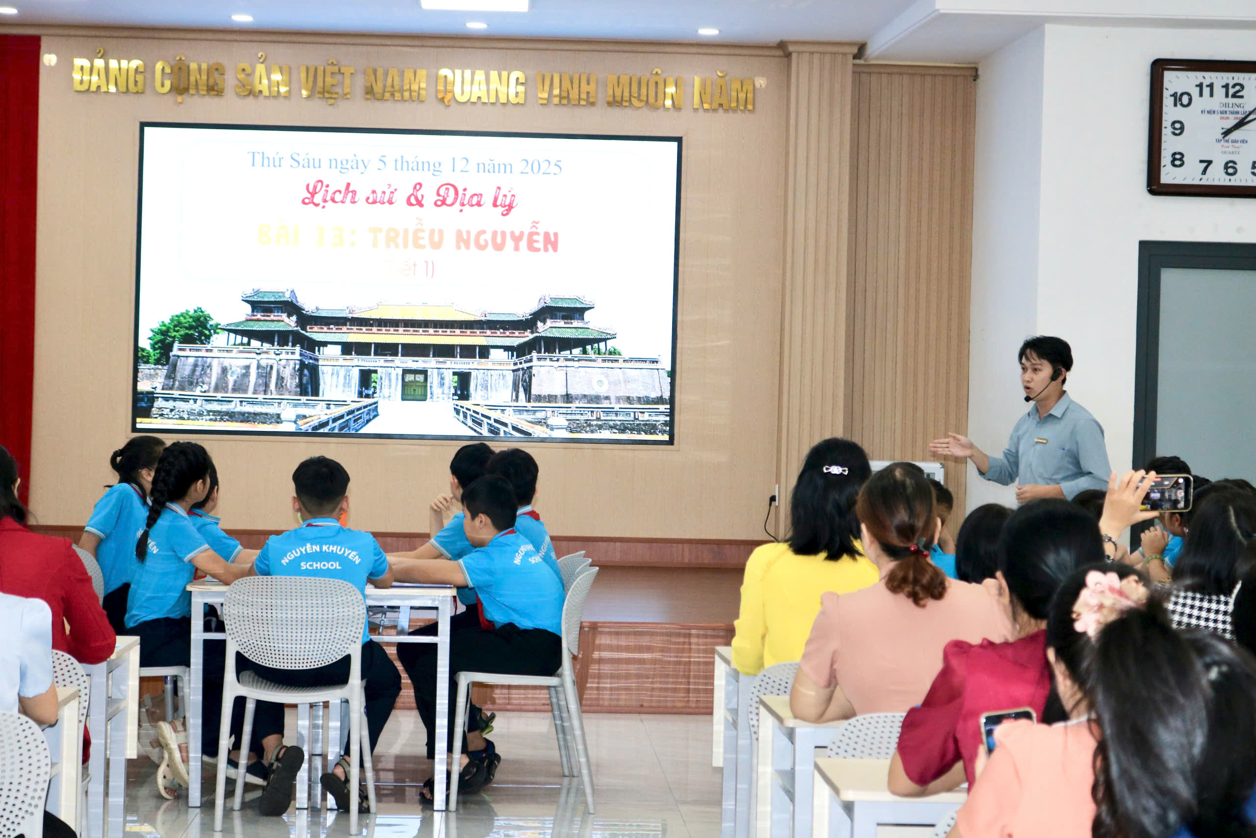 Thực hiện nhiệm vụ năm học 2025 – 2026 của Sở Giáo dục và Đào tạo tỉnh Đắk Lắk và kế hoạch sinh hoạt cụm chuyên môn số 2, chiều ngày 5/12/2025, Trường Tiểu học và THCS Nguyễn Khuyến đã tổ chức thành công sinh hoạt chuyên môn theo hướng nghiên cứu bài học môn Lịch sử và Địa lí lớp 5, bài 13: Triều Nguyễn (Tiết 1) với sự tham dự của 33 CBQL và 49 giáo viên các trường trong cụm.