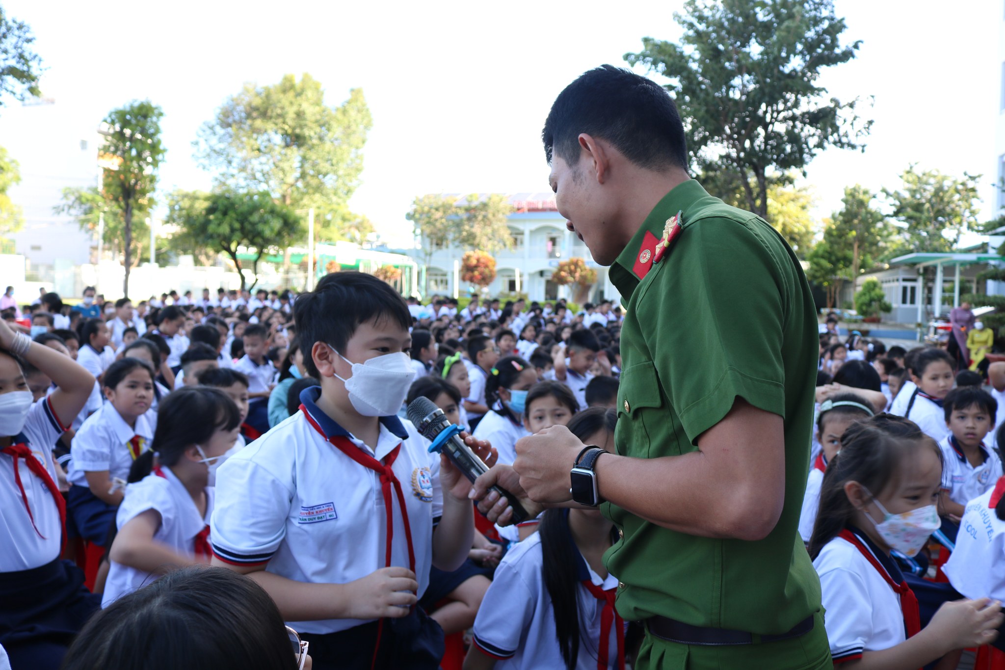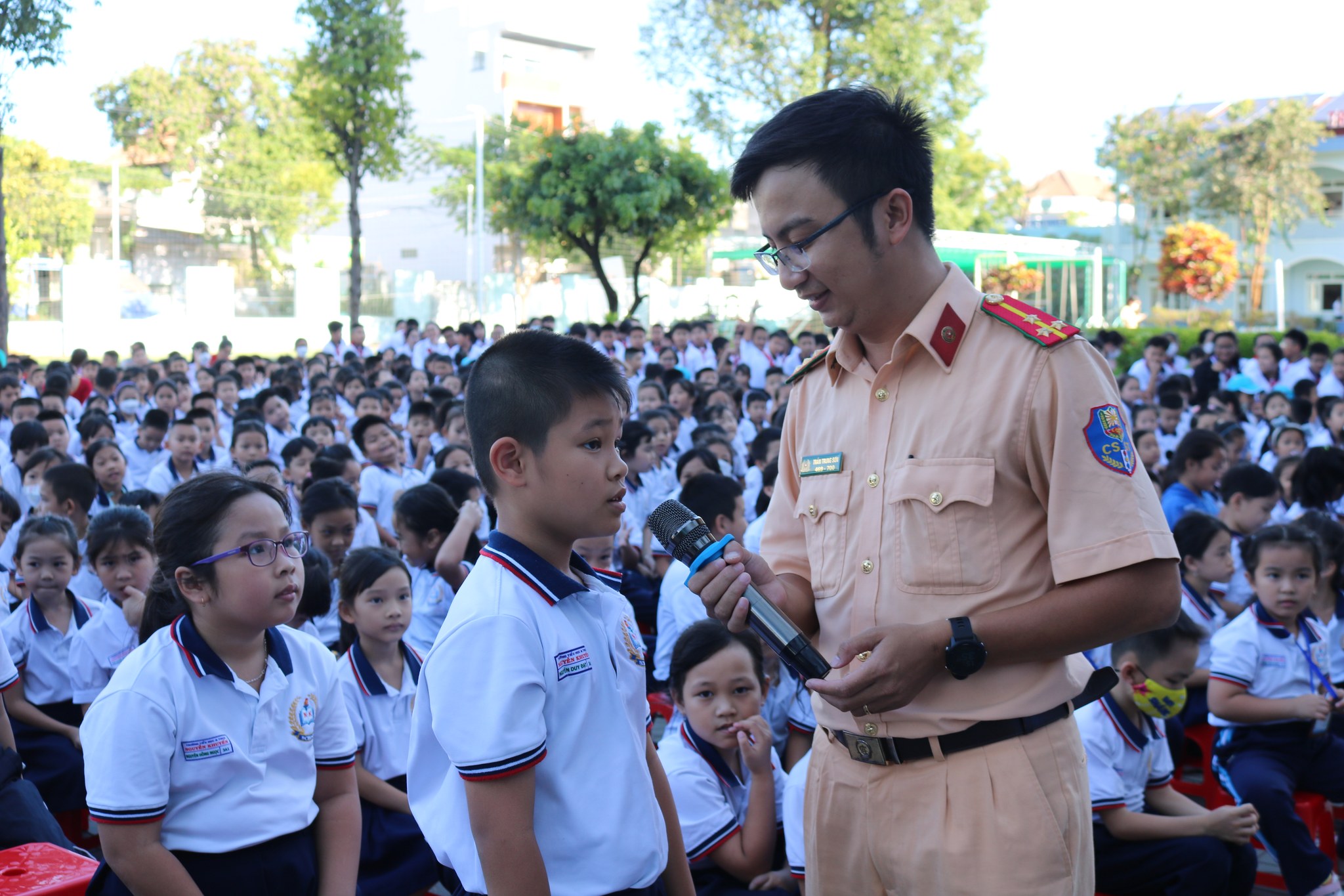 Trong buổi truyên truyền, các em học sinh được nghe đ/c Thượng uý Trần Trung Sơn giới thiệu quy định của Luật Giao thông đường bộ, các hành vi vi phạm luật ATGT, đội nón bảo hiểm khi tham gia giao thông, nhường đường cho các loại xe ưu tiên,..... Đồng thời hướng dẫn HS thực hiện đúng các quy định khi tham gia giao thông.