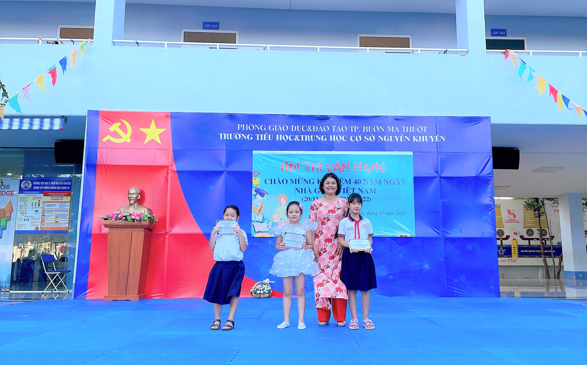 Hòa chung trong không khí tưng bừng, phấn khởi của các thế hệ giáo viên và học sinh trên cả nước chào mừng kỷ niệm 40 năm ngày Nhà giáo Việt Nam (20/11/1982 - 20/11/2022), với sự chỉ đạo sát sao của Chi bộ, Ban giám hiệu nhà trường và đặc biệt với tấm lòng tận tụy với nghề, dành hết tâm huyết cho các em học sinh thân yêu, sự đồng hành cảm thông của quý cha mẹ học sinh, sau hơn một tháng phát động các phong trào thi đua. Chiều ngày 14/11/2022 trường Tiểu học & THCS Nguyễn Khuyến đã tổ chức chung kết Hội thi văn nghệ đồng thời tuyên dương và trao thưởng những tập thể, cá nhân đạt thành tích xuất sắc trong đợt phát động phong trào thi đua chào mừng Kỷ niệm 40 năm ngày Nhà Giáo Việt Nam (20/11/1982-20/11/2022)